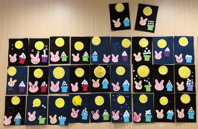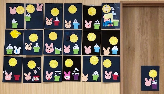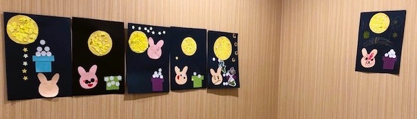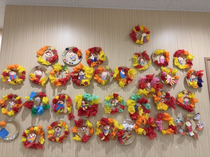 みのむしに画用紙を貼ったり、シールを貼ったり、糸を巻き付けたり…個性豊かな蓑をまとったみのむしが完成しました。リースはお花紙を丸めて貼り、もみじやいちょうなど秋の葉っぱも貼り付けて作りました。カラフルなみのむしリースがまるで紅葉のようにまるソラを彩っています。