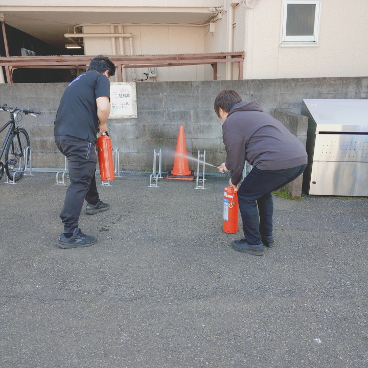 さて、まるソラ谷保では先日ビルの消火訓練が行われ、各階の方々と共に参加ました。消火器の使い方の確認をしたあとは、水消火器を使って放水体験をしました。